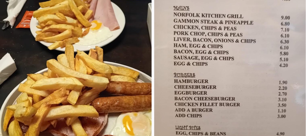 Norfolk Kitchen is known for its hearty breakfasts, particularly the ham, egg, and chips. The portions are generous and offer great value for money. Don't miss the desserts like the Knickerbocker Glory and Chocolate Fudge Cake.
